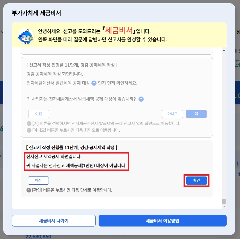 18. 동일하게 전자신고 세액공제 대상이 아니므로 확인을 클릭해줍니다.